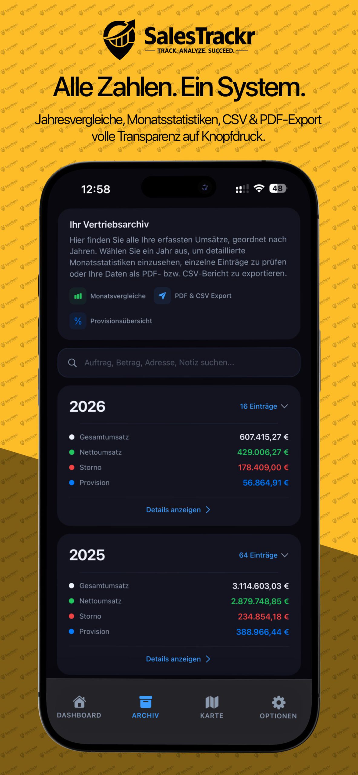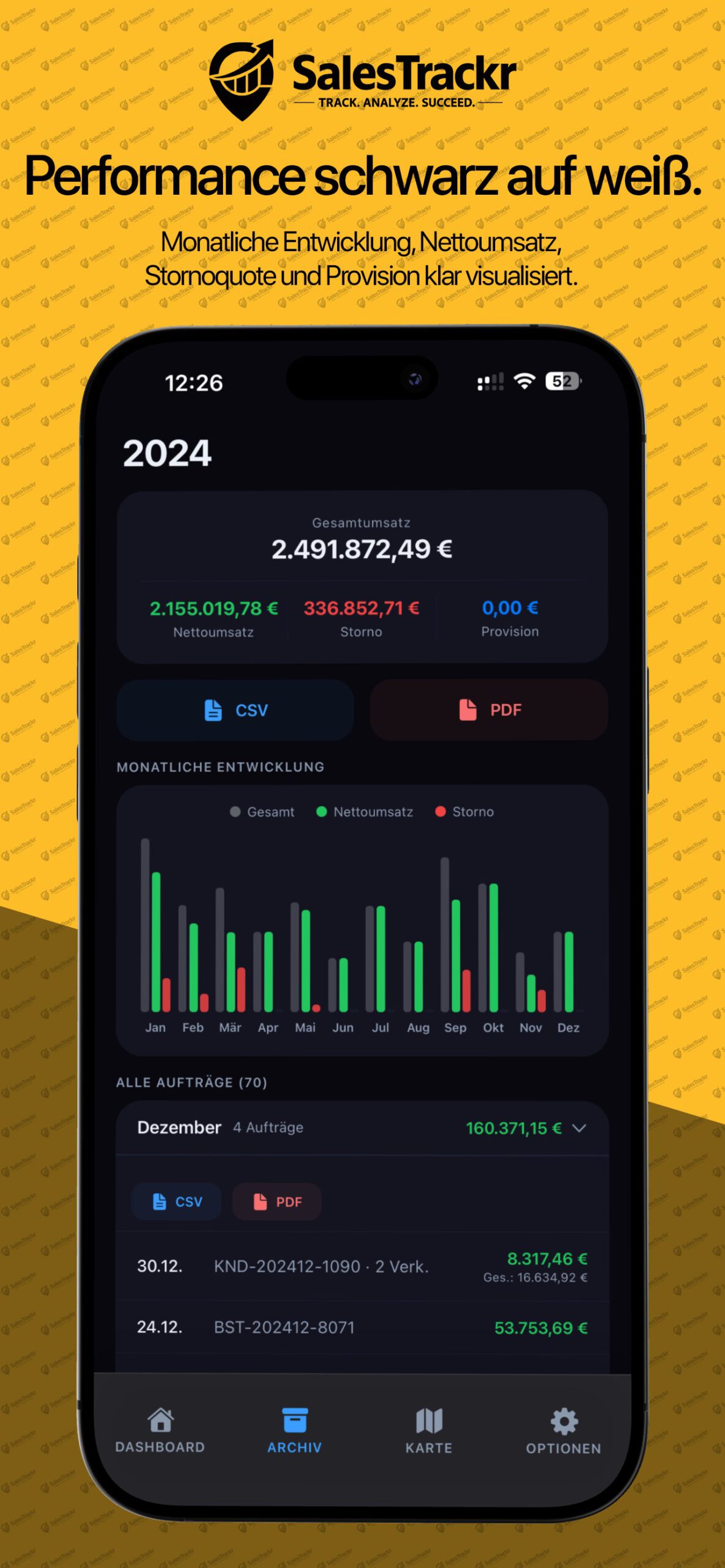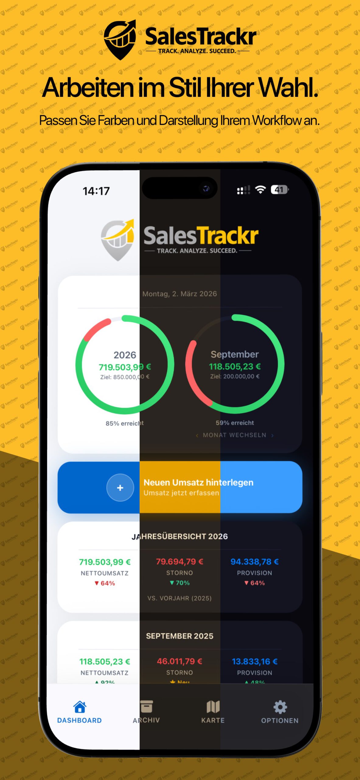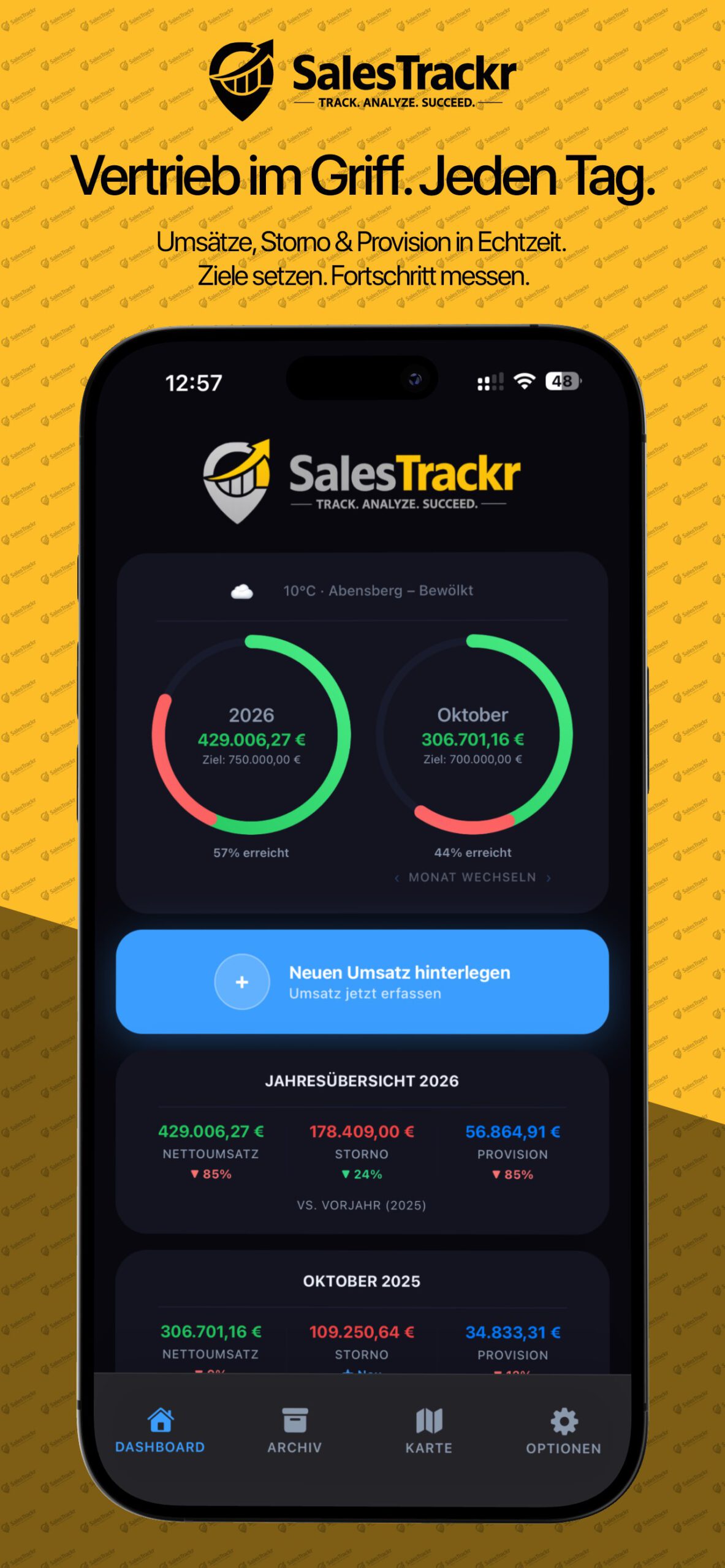 Monats- und Jahresziele auf einen Blick mit animierten Ringen verfolgen. Zieleingabe, Umsatz, Storno und Provisionsanzeige.